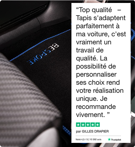Chaque tapis est unique et conçu pour s’adapter parfaitement à votre voiture. Votre attente (7 à 10 jours ouvrables) sera récompensée par un produit exclusif, conçu pour durer dans le temps !